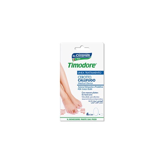 Dr Ciccarelli Timodore Cerotti Callifughi per Calli Duri: cerotti sagomati specifici per il trattamento di calli e formazioni cornee dure localizzate sulle dita dei piedi. Si applicano dopo il pediluvio e hanno una doppia azione estirpante e protettiva. Sono composti da un paracallo protettivo e da un dischetto callifugo, sono anatomici e confortevoli. Dermatologicamente testati.