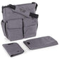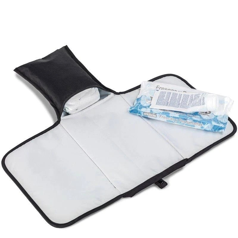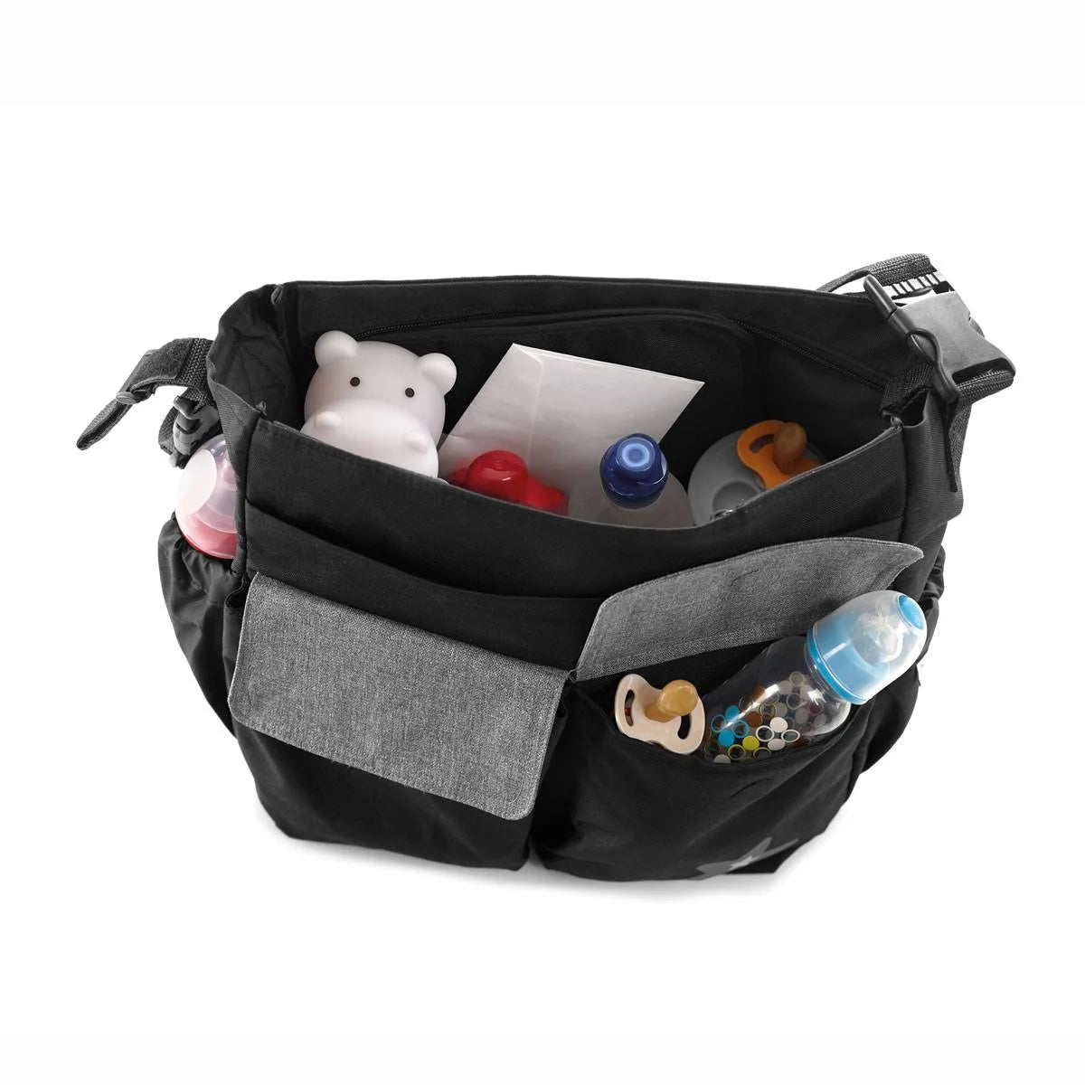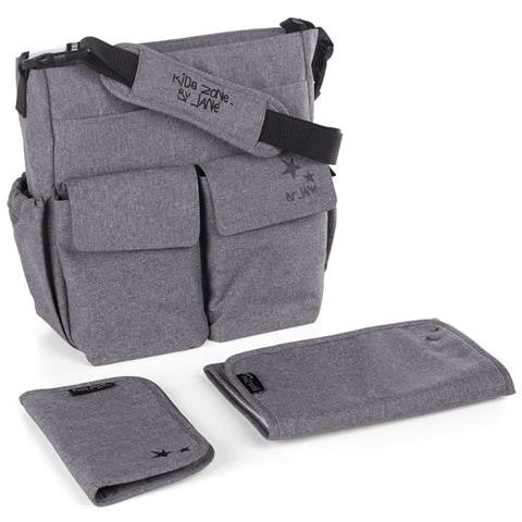 Molto grande all’interno con cerniera esterna include anche un fasciatoio con fodera per i pannolini e un portadocumenti coordinato.