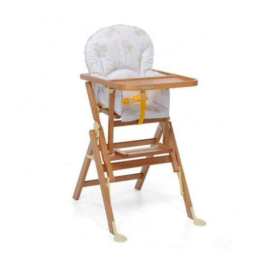 Seggiolone con struttura in legno massiccio. Stabile e sicuro, è posizionabile a due altezze.