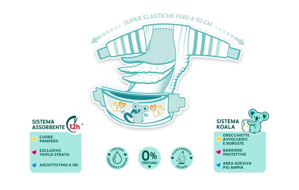 Pampers Baby Dry è il pannolino che offre al tuo bambino un «ASCIUTTO CHE RESPIRA»: grazie alla sua struttura super assorbente e materiali traspiranti, blocca il bagnato lontano dalla pelle mentre lascia passare liberamente l’aria al suo interno per una naturale traspirabilità.