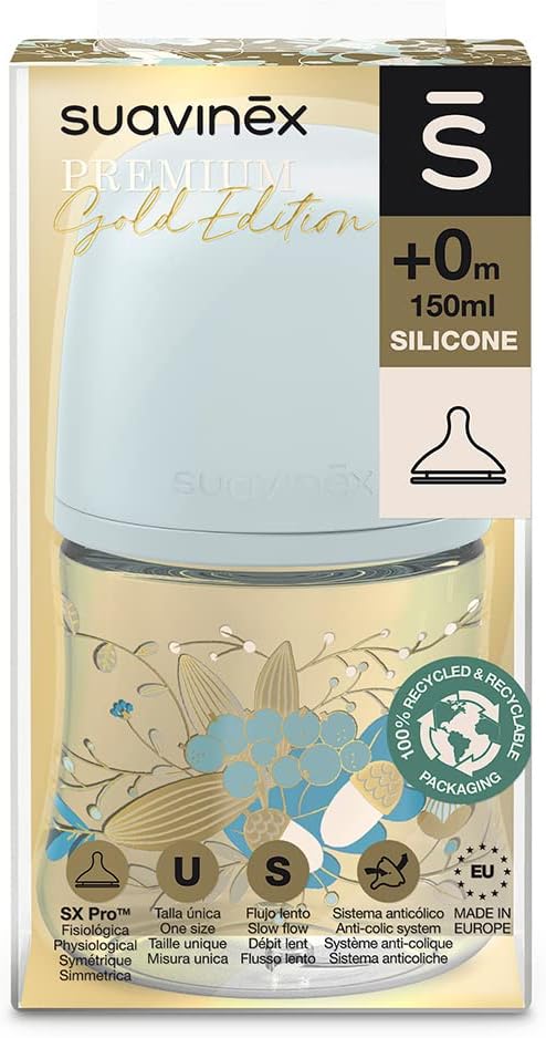 Biberon Suavinex Gold Edition da 150ml con tettarella fisiologica SX Pro a flusso lento. Per bambini +0 mesi. La tettarella Simmetrica SX Pro di Suavinex è il passo definitivo verso un'alimentazione naturale. Progettato per rispettare lo sviluppo del cavo orale del bambino. Questa tettarella simmetrica è stata creata tenendo conto delle particolarità orali e dentali del bambino, la cui mascella e bocca sono in pieno sviluppo. Rispetta le avanzate raccomandazioni professionali per non interferire con lo sviluppo del cavo orale. La tettarella simmetrica SX Pro mantiene la lingua nella stessa posizione naturale di quando il bambino è allattato al seno. Tettarella a flusso lento appositamente studiata per i primi giorni di vita. Lascia passare una piccola quantità di liquido, ottima per bere il latte o per l'acqua in seguito. Con valvola anticolica. Tettarella in pregiato silicone morbido con finitura sabbiata che imita per consistenza e al tatto il capezzolo materno, ottenendo: comfort, flessibilità e adattabilità alla forma del palato. Biberon Suavinex con il Biberon dritto che offre una presa comoda per il bambino. Tettarella SX Pro Approvata dalla Società Spagnola di Odontoiatria Pediatrica. La collezione Gold è realizzata in Europa. Con un imballaggio in plastica riciclata al 100%. Vieni a conoscerci: Siamo Suavinex, un'azienda specializzata nel settore della cura del bambino e della mamma. Tutti i nostri prodotti sono realizzati con grande cura e affetto, per questo siamo sinonimo di sicurezza e fiducia. Come risultato di uno sforzo costante, offriamo un catalogo completo di prodotti con materiali senza Bisfenolo A e una proposta cosmetica ottima e di alta qualità per bambini.