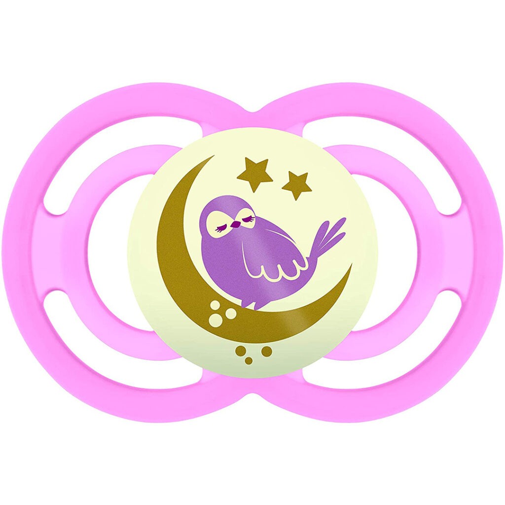 Confezione – mam perfect night 6+, ciuccio notte luminoso con bottone, in silicone skinsoft extra morbido, con porta ciuccio, più motivi, istruzioni in italiano, rosa
