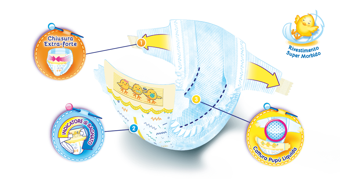 Questi pannolini hanno un filtro a foro largo che assorbe le feci liquide dei neonati, prevenendo l'irritazione della pelle. Inoltre, hanno un indicatore di umidità che cambia colore da giallo a blu per segnalare quando è il momento di cambiare il pannolino.